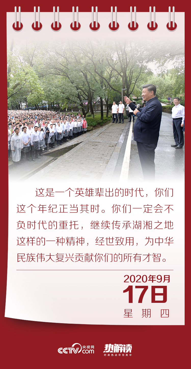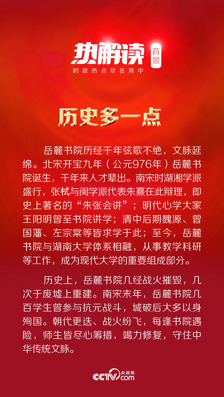 離開校園時,習(xí)近平總書記深情地對師生們說:“岳麓書院一直是我有牽掛,這個學(xué)院在我們的傳統(tǒng)文化中的地位、影響,我還是很有感觸的?!笨倳浱貏e剖析了“惟楚有材,于斯為盛”這副古聯(lián)背后的深意:“于斯為盛,我的體會一個就是我們湖南人才濟(jì)濟(jì),代有才人出啊,有報效祖國的棟梁之材。再有呢,于斯為盛這個‘斯’,是指的這個時代。明年是第十四個‘五年規(guī)劃’開局之年,是我們開啟‘第二個百年’新征程的起點。這是一個英雄輩出的時代,你們這個年紀(jì)正當(dāng)其時?!?/span>