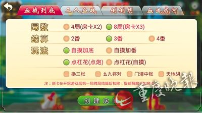 進(jìn)入游戲后,界面顯示“創(chuàng)建房間”和“加入房間”兩項。玩家創(chuàng)建房間時,可選擇局?jǐn)?shù)、玩法等具體設(shè)置,還能選“自摸加底”“自摸加番”“點(diǎn)杠花(點(diǎn)炮)”“點(diǎn)杠花(自摸)”“換三張”等,然后通過微信邀請好友加入牌局。接到邀請的玩家,輸入房間號后就能進(jìn)入牌局,通過手機(jī)聯(lián)網(wǎng)打麻將。