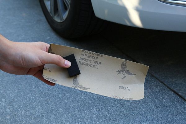 開始補漆作業(yè),先清洗劃痕位置以及周圍地方。先用800的砂紙進行打磨,墊上一塊墊木沾一些水,可以更好掌握砂紙打磨時的力度。將劃痕處的漆面以及傷痕打磨平整并再次清洗擦干。